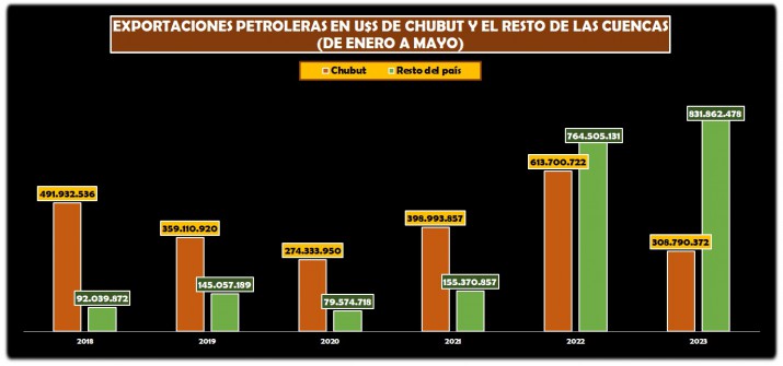 Desde los yacimientos de Chubut se vendieron en cinco meses del 2023 un total de 308,7 millones de dólares frente a los 613,7 millones que se habían exportado en el 2022 y la retracción exportadora fue del 49,7%.